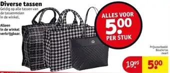 Alles voor €5.00 per stuk! Geldig op alle tassen van de tassenmolen in de winkel. Alleen in de winkel verkrijgbaar. Kom langs en ontdek ons uitgebreide assortiment aan diverse tassen. Van handtassen tot rugzakken, er is voor ieder wat wils. Profiteer van de scherpe prijzen en vind de perfecte tas die bij jouw stijl past. Bijvoorbeeld de Boucle tas zwart, normaal €19.99 nu slechts €5.00. Mis deze kans niet en upgrade je tassencollectie vandaag nog. Wees er snel bij, want op = op! Kom langs in onze winkel en scoor jouw favoriete tas voor een spotprijs.