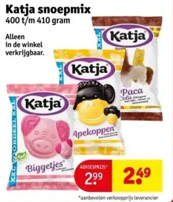 Kruidvat biedt naast de Katja snoepmix een ruime collectie producten aan. Houd de wekelijkse Kruidvat folder in de gaten om de beste aanbiedingen en acties te vinden. Naast Katja snoepmix, kunt u ook de volgende aanbiedingen vinden: Red band snoepmix, Katja Apekoppen & Alle Katja.