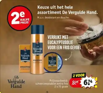 Profiteer nu van de actie waarbij je kunt kiezen uit het hele assortiment van De Vergulde Hand. Met uitzondering van deodorant en douche, kun je alle producten van De Vergulde Hand verkrijgen. De producten zijn verrijkt met eucalyptusolie voor een fris gevoel. Zoals het Prijsvoorbeeld: scheerzeeptablet extra fris 2 x 75 gram voor slechts 8,98 in plaats van 6,74. Mis deze kans niet om jouw favoriete producten van De Vergulde Hand in te slaan voor de helft van de prijs. Geniet van de kwaliteit en frisheid die De Vergulde Hand te bieden heeft en ervaar zelf het verschil met deze unieke actie.