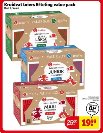 De prijs van de Kruidvat luiers Efteling value pack kan ook teruggevonden worden hierboven op de pagina, samen met de datum van wanneer de aanbieding beschikbaar is. Ook kun je de prijzen in de huidige Kruidvat folder of op de Kruidvat website controleren. De aanbiedingen verzekeren je van het kopen van de Kruidvat producten voor de laagste prijs.