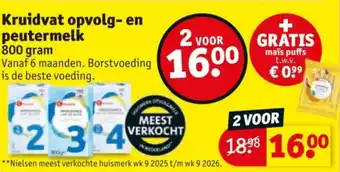Kruidvat opvolg- en peutermelk is speciaal ontwikkeld voor kinderen vanaf 6 maanden als aanvulling op een gevarieerde voeding. Borstvoeding wordt aanbevolen als de beste voeding voor baby's, maar als dit niet mogelijk is, biedt Kruidvat opvolg- en peutermelk een goede alternatieve bron van voedingsstoffen. Deze melk is verrijkt met essentiële vitaminen en mineralen om te helpen bij de groei en ontwikkeling van je kind. Tijdelijk ontvang je bij aankoop van 2 verpakkingen Kruidvat opvolg- en peutermelk een gratis maïs puffs t.w.v. €0,99. Profiteer nu van deze aanbieding en geef je kind de beste start met Kruidvat opvolg- en peutermelk, het meest verkochte huismerk volgens Nielsen.