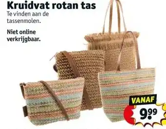 De prijs van de Kruidvat rotan tas kan ook teruggevonden worden hierboven op de pagina, samen met de datum van wanneer de aanbieding beschikbaar is. Ook kun je de prijzen in de huidige Kruidvat folder of op de Kruidvat website controleren. De aanbiedingen verzekeren je van het kopen van de Kruidvat producten voor de laagste prijs.