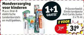 Geef je kinderen de beste mondverzorging met het Elmex tandpasta Anti Cariës Junior multipak. Nu tijdelijk 2 voor slechts €3,99! Deze tandpasta is speciaal ontwikkeld voor kinderen en beschermt tegen gaatjes. Met de unieke formule van Elmex zorg je ervoor dat de tanden van je kinderen gezond en sterk blijven. Profiteer nu van deze geweldige aanbieding en sla gelijk een voorraad in. Let op: deze actie geldt alleen voor de Elmex tandpasta Anti Cariës Junior multipakken en is niet geldig op Oral-B elektrische tandenborstels. Zorg ervoor dat je kinderen elke dag genieten van een frisse en gezonde mond met de mondverzorging van Elmex. Bestel nu en profiteer van 1+1 gratis!