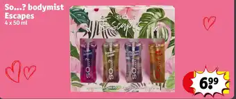 De prijs van de So bodymist Escapes 4 x 50 ml kan ook teruggevonden worden hierboven op de pagina, samen met de datum van wanneer de aanbieding beschikbaar is. Ook kun je de prijzen in de huidige Kruidvat folder of op de Kruidvat website controleren. De aanbiedingen verzekeren je van het kopen van de Kruidvat producten voor de laagste prijs.