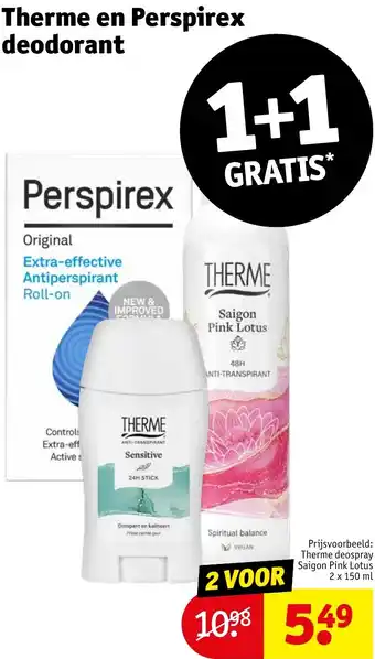De prijs van de Therme en Perspirex deodorant 2 x 150ml kan ook teruggevonden worden hierboven op de pagina, samen met de datum van wanneer de aanbieding beschikbaar is. Ook kun je de prijzen in de huidige Kruidvat folder of op de Kruidvat website controleren. De aanbiedingen verzekeren je van het kopen van de Kruidvat producten voor de laagste prijs.
