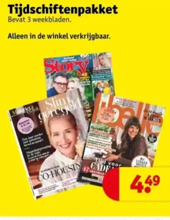 Alleen in de winkel verkrijgbaar, dit tijdschriftenpakket bevat 3 weekbladen: Story, Mania en Slim geregeld. Met interessante artikelen over winter, kerstmarkten en co-housing. Normaal €4,49 per stuk, maar bij aankoop van 2 artikelen geldt een kassakorting: 1+1 en 2+2 wordt verrekend als 50% korting, 2+1 als 33% korting en 2 halve prijs als 25% korting. Haal dit pakket nu in huis en geniet van een divers aanbod aan tijdschriften voor een voordelige prijs. Perfect om lekker te ontspannen en bij te blijven met de laatste nieuwtjes en trends. Mis deze aanbieding niet!