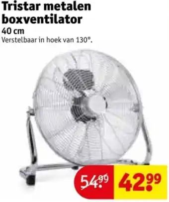 De Tristar metalen boxventilator is momenteel met korting verkrijgbaar bij Kruidvat. Hier vind je alle details over prijs, geldigheidsduur en actievoorwaarden. Vergeet niet om ook andere aanbiedingen en deals voor Tristar metalen boxventilator te bekijken zodat je zeker weet dat je de beste prijs betaalt. De kortingsactie loopt van 07-04-2026 tot 19-04-2026. Is de actie inmiddels verlopen? Geen zorgen, vergelijk dan soortgelijke aanbiedingen of volg de productcategorie voor toekomstige prijsverlagingen. Zo koop je altijd met voordeel.Veelgestelde vragen over Tristar metalen boxventilator