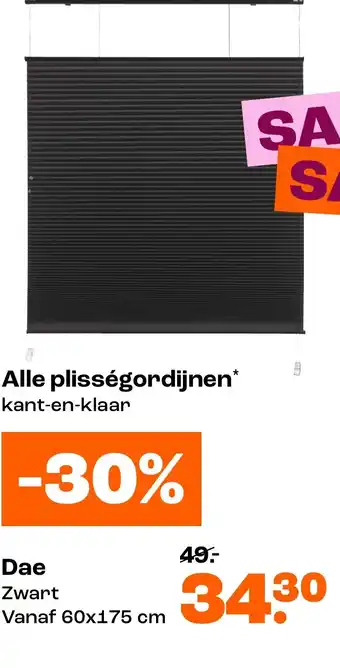Profiteer nu van de geweldige aanbieding op alle plisségordijnen! Deze kant-en-klare gordijnen zijn verkrijgbaar in de kleur zwart en in verschillende maten, vanaf 60x175 cm. Met maar liefst 30% korting betaal je slechts €49,- in plaats van €34,30. Deze prachtige plisségordijnen zijn niet alleen een stijlvolle toevoeging aan je interieur, maar bieden ook privacy en bescherming tegen zonlicht. Of je nu op zoek bent naar een gordijn voor de slaapkamer, woonkamer of kantoor, bij ons vind je gegarandeerd wat je zoekt. Wacht niet langer en profiteer van deze geweldige deal op alle plisségordijnen. Haal ze nu in huis en geniet van de sfeer en functionaliteit die ze met zich meebrengen!