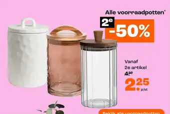 Vanaf vandaag zijn alle voorraadpotten in de aanbieding met maar liefst 50% korting op het 2e artikel. Met keuze uit meer dan 225 verschillende voorraadpotten zit er altijd wel iets voor jou bij. De voorraadpotten zijn verkrijgbaar vanaf slechts 4.50 euro per stuk. Mis deze kans niet om jouw keuken op te fleuren en al je etenswaren netjes op te bergen. Of je nu op zoek bent naar glazen voorraadpotten, plastic voorraadpotten of voorraadpotten van keramiek, wij hebben het allemaal. Bekijk nu ons assortiment en profiteer van deze geweldige aanbieding. *Actie geldig op alle voorraadpotten, korting wordt verrekend bij het afrekenen.