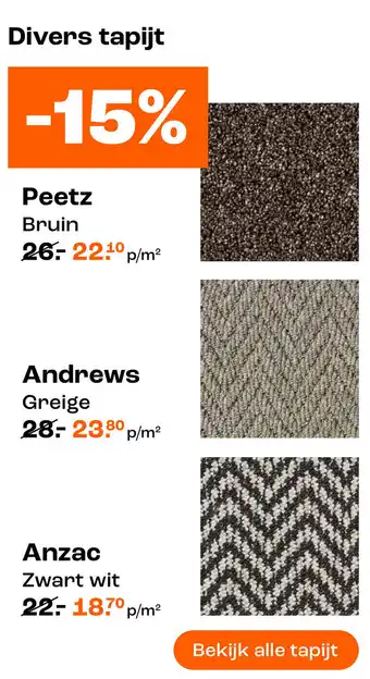 Ben je op zoek naar divers tapijt voor in huis? Ontdek ons assortiment met onder andere Peetz Bruin, Andrews en Greige tapijten. Ook hebben we prachtige Anzac Zwart wit tapijten die zorgen voor een stijlvolle uitstraling in elke ruimte. Of je nu op zoek bent naar een warme en gezellige sfeer of juist een strak en modern interieur wilt creëren, bij ons vind je het perfecte tapijt. Bekijk alle tapijten in verschillende kleuren en patronen en kies het tapijt dat het beste bij jouw wensen en interieur past. Laat je inspireren door ons diverse aanbod en geef je huis een nieuwe look met een prachtig tapijt.