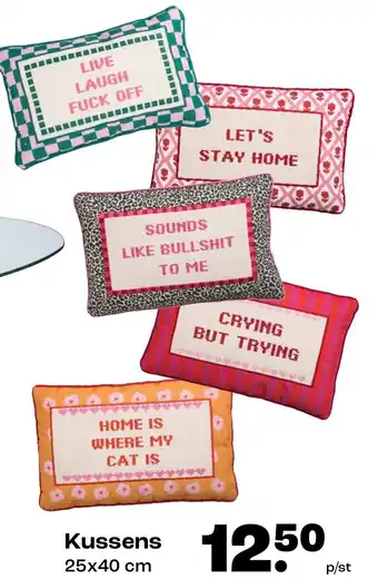 Breng wat humor en stijl in je interieur met deze trendy kussens van 25x40 cm. Kies uit opvallende teksten zoals 'LIVE LAUGH FUCK OFF', 'LET'S STAY HOME' of 'SOUNDS LIKE BULLSHIT TO ME'. Of ga voor een meer emotionele touch met 'CRYING BUT TRYING' of 'HOME IS WHERE MY CAT IS'. Deze kussens zijn niet alleen decoratief, maar ook comfortabel en van hoge kwaliteit. Perfect voor op de bank, in de slaapkamer of op een stoel. Voor slechts 12.50 per stuk voeg je eenvoudig wat persoonlijkheid toe aan elke ruimte in huis. Bestel nu en geef je interieur een unieke uitstraling!