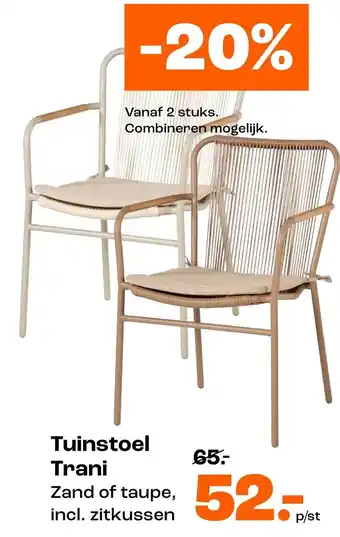 De Tuinstoel Trani is een stijlvolle toevoeging aan je tuin of terras. Deze comfortabele tuinstoel is verkrijgbaar in de kleuren zand of taupe en wordt geleverd inclusief zitkussen voor extra zitcomfort. Profiteer nu van 20% korting bij aankoop van 2 stuks of meer. Je kunt de Tuinstoel Trani ook combineren met andere tuinmeubelen uit ons assortiment. De normale prijs van de stoel is 65,-, maar met de korting betaal je slechts 52,- per stuk. Geniet van lange zomeravonden in stijl en comfort met de Tuinstoel Trani. Bestel snel en maak jouw tuin klaar voor het buitenseizoen!