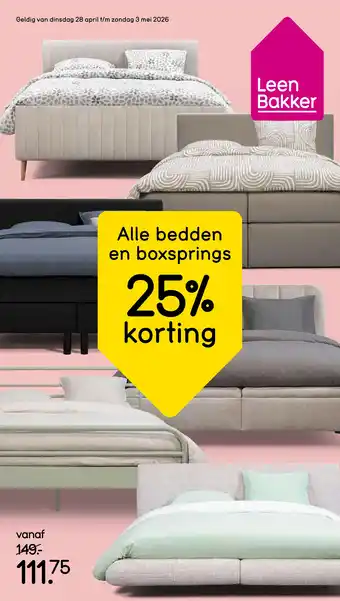 Nu in de aanbieding bij Leen Bakker: Alle bedden en boxsprings 25% korting✅ Actie geldig van 28-04 t/m 2-05.