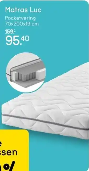 Profiteer nu van 40% korting op alle matrassen, waaronder het Matras Luc Pocketvering 70x200x19 cm voor slechts 95.40 in plaats van 159,-. Deze pocketvering matras biedt uitstekende ondersteuning en comfort voor een goede nachtrust. Met de afmetingen van 70x200x19 cm past dit matras perfect op een eenpersoonsbed. De pocketveren zorgen voor een optimale verdeling van het lichaamsgewicht en bieden de juiste ondersteuning aan het lichaam. Door de 40% korting is dit hoogwaardige matras nu extra voordelig geprijsd. Profiteer snel van deze aanbieding en geniet van een goede nachtrust op een kwaliteitsmatras voor een scherpe prijs!
