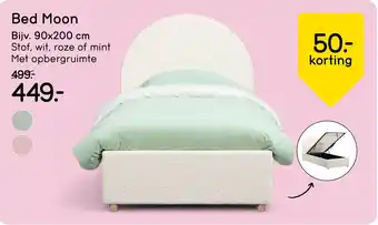 De Bed Moon is een stijlvol en praktisch bed met een afmeting van 90x200 cm. Het bed is verkrijgbaar in de kleuren wit, roze en mint en is gemaakt van hoogwaardige stof. Dankzij de handige opbergruimte onder het bed kun je gemakkelijk extra spullen opbergen en zorg je voor een opgeruimde slaapkamer. Profiteer nu van een korting van 50,- op de Bed Moon, van 499,- voor slechts 449,-. Dit bed is niet alleen comfortabel om in te slapen, maar ook een echte eyecatcher in je slaapkamer. Haal de Bed Moon vandaag nog in huis en geniet van een goede nachtrust in stijl.