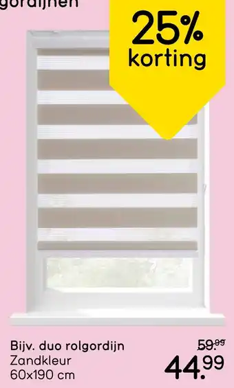 Op zoek naar stijlvolle raamdecoratie met korting? Kies dan voor onze duo rolgordijnen in zandkleur van 60x190 cm. Deze prachtige rolgordijnen combineren de functionaliteit van een standaard rolgordijn met de elegantie van een horizontale jaloezie. Met de mogelijkheid om de lichtinval en privacy naar wens aan te passen, zijn duo rolgordijnen ideaal voor elke ruimte in huis. Het zandkleurige design zorgt voor een warme en moderne uitstraling. En met de huidige korting van 25% betaal je slechts €44.99 in plaats van €59.99. Profiteer nu van deze aanbieding en geef je interieur een upgrade met onze duo rolgordijnen. Bestel snel en geniet van sfeervolle en praktische raamdecoratie!