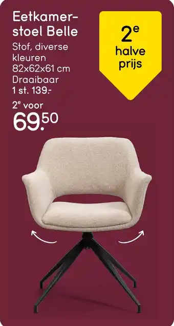 De eetkamerstoel Belle is een stijlvolle toevoeging aan je eetkamer. Met zijn afmetingen van 82x62x61 cm biedt hij comfortabele zitruimte. De stoel is draaibaar en verkrijgbaar in diverse kleuren stof, zodat je hem kunt aanpassen aan jouw interieur. En het beste van alles, je kunt nu profiteren van een speciale aanbieding: de tweede stoel Belle is voor de halve prijs, slechts 69,50 euro! Mis deze kans niet om je eetkamer een upgrade te geven met deze prachtige eetkamerstoelen. Bestel ze vandaag nog en geniet van stijl en comfort tijdens al je maaltijden.