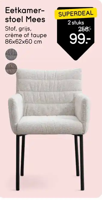 De Eetkamer- stoel Mees is momenteel met korting verkrijgbaar bij Leen Bakker. Hier vind je alle details over prijs, geldigheidsduur en actievoorwaarden. Vergeet niet om ook andere aanbiedingen en deals voor Eetkamer- stoel Mees te bekijken zodat je zeker weet dat je de beste prijs betaalt. De kortingsactie loopt van 23-02-2026 tot 01-03-2026. Is de actie inmiddels verlopen? Geen zorgen, vergelijk dan soortgelijke aanbiedingen of volg de productcategorie voor toekomstige prijsverlagingen. Zo koop je altijd met voordeel.Veelgestelde vragen over Eetkamer- stoel Mees