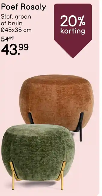 De Poef Rosaly is een stijlvolle toevoeging aan elk interieur. Deze poef is verkrijgbaar in de kleuren groen of bruin en heeft een afmeting van 45x35 cm. De poef is gemaakt van hoogwaardige stof en biedt een comfortabele zitplek of een handige voetensteun. Normaal gesproken kost de Poef Rosaly 54.99, maar nu profiteer je van een korting van 20% waardoor de prijs slechts 43.99 is. Deze poef is niet alleen praktisch, maar ook nog eens betaalbaar. Haal de Poef Rosaly vandaag nog in huis en geniet van zijn veelzijdigheid en comfort. Perfect voor in de woonkamer, slaapkamer of zelfs op kantoor.