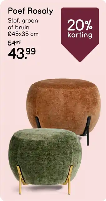 De Poef Rosaly is een stijlvolle toevoeging aan elk interieur. Deze poef is verkrijgbaar in de kleuren groen of bruin en heeft een afmeting van 45x35 cm. De poef is gemaakt van hoogwaardige stof en biedt een comfortabele zitplek of een handige voetensteun. Dankzij de hoge kwaliteit materialen is de poef duurzaam en gaat deze lang mee. Normaal gesproken kost de Poef Rosaly 54.99, maar nu profiteer je van maar liefst 20% korting en betaal je slechts 43.99. Haal deze trendy poef vandaag nog in huis en geef je woonkamer een frisse uitstraling. Bestel de Poef Rosaly nu en geniet van comfort en stijl in één!