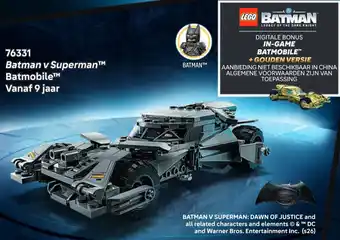 Breng de strijd tussen Batman™ en Superman™ tot leven met de LEGO BATMAN v Superman Batmobile™ 76331 set. Vanaf 9 jaar kunnen fans genieten van het bouwen van deze iconische Batmobile™ uit de film BATMAN V SUPERMAN: DAWN OF JUSTICE. De set bevat ook een gouden versie van de Batmobile™ en een digitale bonus in-game. Met de LEGO BATMAN Legacy of the Dark Knight collectie kunnen kinderen hun favoriete superhelden en voertuigen verzamelen. Let op: deze aanbieding is niet beschikbaar in China. Algemene voorwaarden zijn van toepassing. BATMAN™, THE BATMAN en alle gerelateerde personages en elementen zijn eigendom van DC en Warner Bros. Entertainment Inc. (s26).