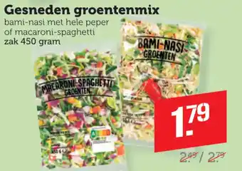 De gesneden groentenmix is een handige zak van 450 gram vol met een mix van verse groenten, perfect voor het bereiden van bami, nasi, macaroni of spaghetti. Deze mix bevat onder andere paprika, prei, wortel en ui, waardoor je gerecht direct een gezonde en kleurrijke boost krijgt. Met deze kant-en-klare groenten hoef je zelf niet meer te snijden en bespaar je kostbare tijd in de keuken. De gesneden groentenmix is ideaal voor drukke dagen waarop je snel een voedzame maaltijd op tafel wilt zetten. Voeg de groenten toe aan je favoriete gerecht en geniet van de heerlijke smaak en knapperige textuur. Een zak vol gemak en smaak voor slechts €1.79.