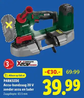 Deze krachtige Accu-bandzaag 20 V zonder accu en lader van het merk PARKSIDE is ideaal voor het zagen van diverse materialen met een zaagdiepte tot 63.5 mm. Met deze handige zaag kun je nauwkeurig en efficiënt te werk gaan. De accu en lader zijn niet inbegrepen, maar kunnen apart worden aangeschaft. Profiteer nu van de speciale aanbieding op lidl.nl en bespaar €30.- op de normale prijs van €69.99. Met 3 jaar garantie ben je verzekerd van een duurzaam en betrouwbaar product. Haal deze Accu-bandzaag in huis en maak al je zaagklussen een stuk eenvoudiger en sneller!