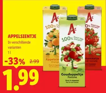 Lidl biedt naast de Appelsientje een ruime collectie producten aan. Houd de wekelijkse Lidl folder in de gaten om de beste aanbiedingen en acties te vinden. Naast Appelsientje, kunt u ook de volgende aanbiedingen vinden: Appelsientje, Appelsientje 100% sap of DubbelDrank & Appelsientje Kids framboos.