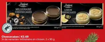 Geniet van onze heerlijke Deluxe Cheesecakes in de varianten millionaire en citroen. Deze verpakking bevat 2 x 90 g cheesecakes voor slechts €2.69. Onze cheesecakes zijn perfect voor een verwenmomentje tussendoor of als dessert na een heerlijke maaltijd. De romige textuur en rijke smaak van de cheesecakes zullen je zeker verrassen en je smaakpapillen verwennen. Of je nu een liefhebber bent van de klassieke millionaire cheesecake of liever iets frisser proeft met de citroen cheesecake, er is voor ieder wat wils. Bestel nu onze Deluxe Cheesecakes en trakteer jezelf op een smaakvolle traktatie die je niet snel zult vergeten.