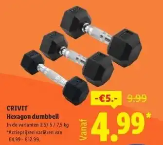 De prijs van de CRIVITHexagon dumbbell kan ook teruggevonden worden hierboven op de pagina, samen met de datum van wanneer de aanbieding beschikbaar is. Ook kun je de prijzen in de huidige Lidl folder of op de Lidl website controleren. De aanbiedingen verzekeren je van het kopen van de Lidl producten voor de laagste prijs.