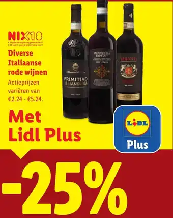 Geniet van een selectie van diverse Italiaanse rode wijnen, waaronder Primitivo Manduria, Valpolicella Ripasso, Chianti Riserva en meer. Profiteer van actieprijzen variërend van €2.24 tot €5.24 per fles. Met Lidl Plus ontvang je nog eens 25% korting op geselecteerde wijnen. Vergeet niet: NIX18, wij verkopen geen alcohol aan personen onder de 18 jaar. Ben je onder de 25 jaar? Laat dan altijd je legitimatie zien! Ontdek de heerlijke smaken van Italiaanse wijnen en profiteer van de voordelen van Lidl Plus. Santé!