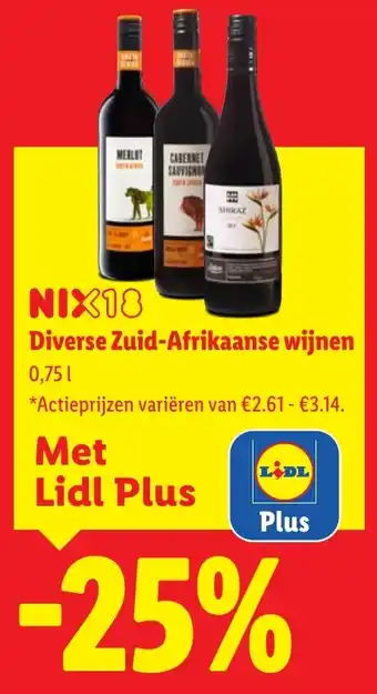 Ontdek een selectie van diverse Zuid-Afrikaanse wijnen bij Lidl, waaronder Merlot, Nix 18, Cabernet Sauvignon en Shiraz. Deze kwaliteitswijnen hebben een inhoud van 0,75 liter en zijn nu extra voordelig met Lidl Plus. Profiteer van actieprijzen variërend van €2,61 tot €3,14 per fles. Met Lidl Plus ontvang je nog eens 25% korting op deze al scherp geprijsde wijnen. Of je nu op zoek bent naar een fruitige Merlot of een krachtige Shiraz, bij Lidl vind je voor elk wat wils. Geniet van de rijke smaken en aroma's van Zuid-Afrikaanse wijnen en haal ze nu voordelig in huis met Lidl Plus.