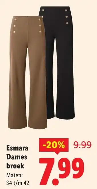 De prijs van de Esmara Dames broek kan ook teruggevonden worden hierboven op de pagina, samen met de datum van wanneer de aanbieding beschikbaar is. Ook kun je de prijzen in de huidige Lidl folder of op de Lidl website controleren. De aanbiedingen verzekeren je van het kopen van de Lidl producten voor de laagste prijs.
