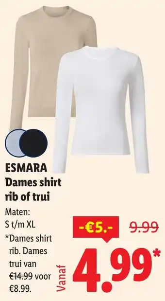 De prijs van de Esmara Dames shirt rib of trui kan ook teruggevonden worden hierboven op de pagina, samen met de datum van wanneer de aanbieding beschikbaar is. Ook kun je de prijzen in de huidige Lidl folder of op de Lidl website controleren. De aanbiedingen verzekeren je van het kopen van de Lidl producten voor de laagste prijs.