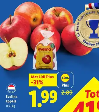 Ontdek de heerlijke smaak van de beste Evelina appels, geteeld op Nederlandse bodem. Met Lidl Plus ontvang je nu 31% korting op een tas van 1 kg, van €2.89 voor slechts €1.99. Proef de sappige en knapperige appels die perfect zijn voor tussendoor of in een frisse salade. De Evelina appels zijn van topkwaliteit en worden hoog gewaardeerd door consumenten volgens YouGov. Haal deze verrukkelijke appels nu in de supermarkt en geniet van een gezonde snack. Mis deze aanbieding niet en profiteer tot 2025 van de korting van 41%. DAS PAS EEN APPELI!