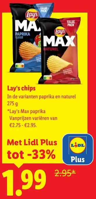 Geniet van de heerlijke smaak van Lay's chips in de varianten paprika en naturel met deze voordelige value pack. De Lay's Max paprika chips zijn extra knapperig en vol van smaak. De prijzen variëren van €2.75 tot €2.95, maar met Lidl Plus kun je tot wel 33% korting krijgen en betaal je slechts €1.99 of €2.95. Haal deze lekkere chips in huis voor een gezellige avond op de bank of voor een feestje met vrienden. Met Lay's chips zit je altijd goed!