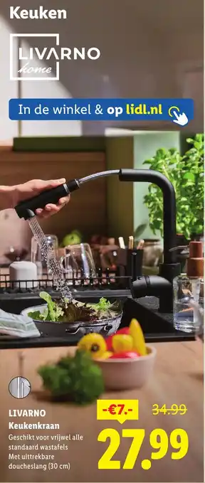De LIVARNO Keukenkraan is een praktische toevoeging aan elke keuken. Met een uittrekbare doucheslang van 30 cm is deze kraan ideaal voor het afspoelen van groenten, het schoonmaken van de gootsteen en andere klusjes in de keuken. De kraan is geschikt voor vrijwel alle standaard wastafels en is verkrijgbaar voor een scherpe prijs van slechts €27.99. Je kunt de LIVARNO Keukenkraan zowel in de winkel als op lidl.nl aanschaffen. Profiteer nu van de tijdelijke korting van €7.- en haal deze handige keukenkraan snel in huis. Met zijn moderne design en praktische functies is de LIVARNO Keukenkraan een must-have voor elke keuken.
