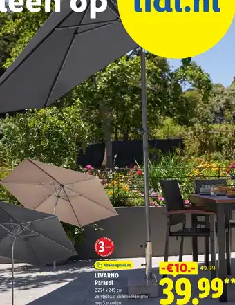 De Livarno Parasol is momenteel met korting verkrijgbaar bij Lidl. Hier vind je alle details over prijs, geldigheidsduur en actievoorwaarden. Vergeet niet om ook andere aanbiedingen en deals voor Livarno Parasol te bekijken zodat je zeker weet dat je de beste prijs betaalt. De kortingsactie loopt van 06-05-2026 tot 10-05-2026. Is de actie inmiddels verlopen? Geen zorgen, vergelijk dan soortgelijke aanbiedingen of volg de productcategorie voor toekomstige prijsverlagingen. Zo koop je altijd met voordeel.Veelgestelde vragen over Livarno Parasol