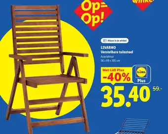 De prijs van de Livarno Verstelbare Tuinstoel kan ook teruggevonden worden hierboven op de pagina, samen met de datum van wanneer de aanbieding beschikbaar is. Ook kun je de prijzen in de huidige Lidl folder of op de Lidl website controleren. De aanbiedingen verzekeren je van het kopen van de Lidl producten voor de laagste prijs.
