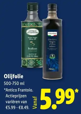 De prijs van de Olijfolie kan ook teruggevonden worden hierboven op de pagina, samen met de datum van wanneer de aanbieding beschikbaar is. Ook kun je de prijzen in de huidige Lidl folder of op de Lidl website controleren. De aanbiedingen verzekeren je van het kopen van de Lidl producten voor de laagste prijs.