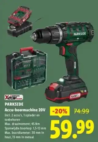 De PARKSIDE Accu-boormachine 20V is momenteel met korting verkrijgbaar bij Lidl. Hier vind je alle details over prijs, geldigheidsduur en actievoorwaarden. Vergeet niet om ook andere aanbiedingen en deals voor PARKSIDE Accu-boormachine 20V te bekijken zodat je zeker weet dat je de beste prijs betaalt. De kortingsactie loopt van 09-03-2026 tot 15-03-2026. Is de actie inmiddels verlopen? Geen zorgen, vergelijk dan soortgelijke aanbiedingen of volg de productcategorie voor toekomstige prijsverlagingen. Zo koop je altijd met voordeel.Veelgestelde vragen over PARKSIDE Accu-boormachine 20V