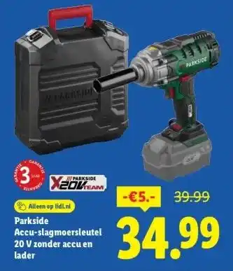 De prijs van de Parkside Accu-slagmoersleutel 20 V zonder accu en lader kan ook teruggevonden worden hierboven op de pagina, samen met de datum van wanneer de aanbieding beschikbaar is. Ook kun je de prijzen in de huidige Lidl folder of op de Lidl website controleren. De aanbiedingen verzekeren je van het kopen van de Lidl producten voor de laagste prijs.