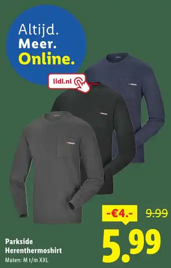 De prijs van de Parkside Herenthermoshirt kan ook teruggevonden worden hierboven op de pagina, samen met de datum van wanneer de aanbieding beschikbaar is. Ook kun je de prijzen in de huidige Lidl folder of op de Lidl website controleren. De aanbiedingen verzekeren je van het kopen van de Lidl producten voor de laagste prijs.