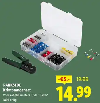 Met de PARKSIDE Krimptangenset kun je eenvoudig kabels krimpen met diameters van 0,50-10 mm². Deze set bestaat uit maar liefst 1801 delen, waardoor je voor elke klus het juiste gereedschap bij de hand hebt. De tangen zijn van hoge kwaliteit en zorgen voor een nauwkeurige en stevige verbinding. Dankzij de ergonomische handgrepen liggen de tangen comfortabel in de hand en kun je langdurig werken zonder last te krijgen van je handen. Normaal gesproken kost deze set €19.99, maar nu profiteer je van een korting van €5.- en betaal je slechts €14.99. Een uitstekende deal voor iedereen die regelmatig met kabels werkt en op zoek is naar betrouwbaar gereedschap.