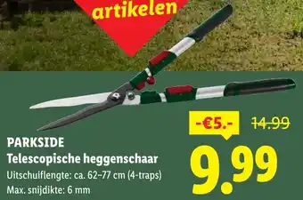 De prijs van de Parkside Telescopische heggenschaar kan ook teruggevonden worden hierboven op de pagina, samen met de datum van wanneer de aanbieding beschikbaar is. Ook kun je de prijzen in de huidige Lidl folder of op de Lidl website controleren. De aanbiedingen verzekeren je van het kopen van de Lidl producten voor de laagste prijs.