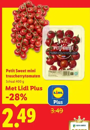 Geniet van de heerlijke Petit Sweet mini troscherrytomaten in een handige schaal van 400 g, nu met 28% korting voor Lidl Plus leden. Deze sappige en zoete cherrytomaten zijn perfect voor salades, pasta's of gewoon als gezonde snack tussendoor. Haal het beste uit je boodschappen bij Lidl, de beste winkelketen van Nederland volgens ABN-AMRO. Voor slechts 2.49 euro per schaal van 400 g kun je genieten van de lekkerste cherrytomaten van Nederland. Profiteer van deze aanbieding en word lid van Lidl Plus om nog meer voordeel te ontvangen. Mis het niet en haal vandaag nog jouw Petit Sweet mini troscherrytomaten in huis!