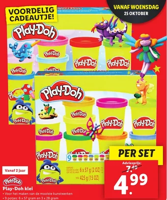 De Play Doh Klei is momenteel met korting verkrijgbaar bij Lidl. Hier vind je alle details over prijs, geldigheidsduur en actievoorwaarden. Vergeet niet om ook andere aanbiedingen en deals voor Play Doh Klei te bekijken zodat je zeker weet dat je de beste prijs betaalt. De kortingsactie loopt van 23-10-2025 tot 29-10-2025. Is de actie inmiddels verlopen? Geen zorgen, vergelijk dan soortgelijke aanbiedingen of volg de productcategorie voor toekomstige prijsverlagingen. Zo koop je altijd met voordeel.Veelgestelde vragen over Play Doh Klei