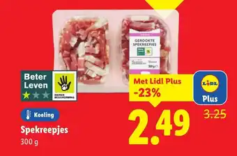 Geniet van heerlijke GEROOKTE SPEKREEPJES van Beter Leven met deze aanbieding van -23% voor Lidl Plus leden. Deze kwaliteitsvolle spekreepjes zijn afkomstig van dieren die met zorg zijn behandeld volgens de richtlijnen van Beter Leven. De dierenwelzijnsorganisatie BESCHERMING staat garant voor een diervriendelijke productie. De Spekreepjes 300 g zijn perfect voor diverse gerechten en kunnen zowel in de koeling als in de vriezer bewaard worden. Profiteer nu van deze aanbieding en betaal slechts 2.49 in plaats van 3.25. Haal deze smaakvolle spekreepjes in huis en geniet van een heerlijke maaltijd met Beter Leven keurmerk.