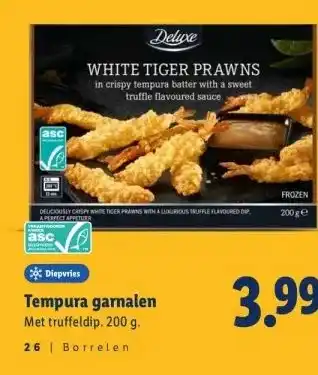 De prijs van de Tempura garnalen kan ook teruggevonden worden hierboven op de pagina, samen met de datum van wanneer de aanbieding beschikbaar is. Ook kun je de prijzen in de huidige Lidl magazine of op de Lidl website controleren. De aanbiedingen verzekeren je van het kopen van de Lidl producten voor de laagste prijs.