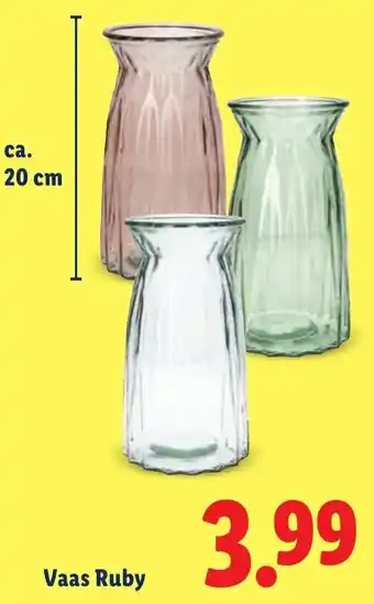 De prijs van de Vaas Ruby kan ook teruggevonden worden hierboven op de pagina, samen met de datum van wanneer de aanbieding beschikbaar is. Ook kun je de prijzen in de huidige Lidl folder of op de Lidl website controleren. De aanbiedingen verzekeren je van het kopen van de Lidl producten voor de laagste prijs.